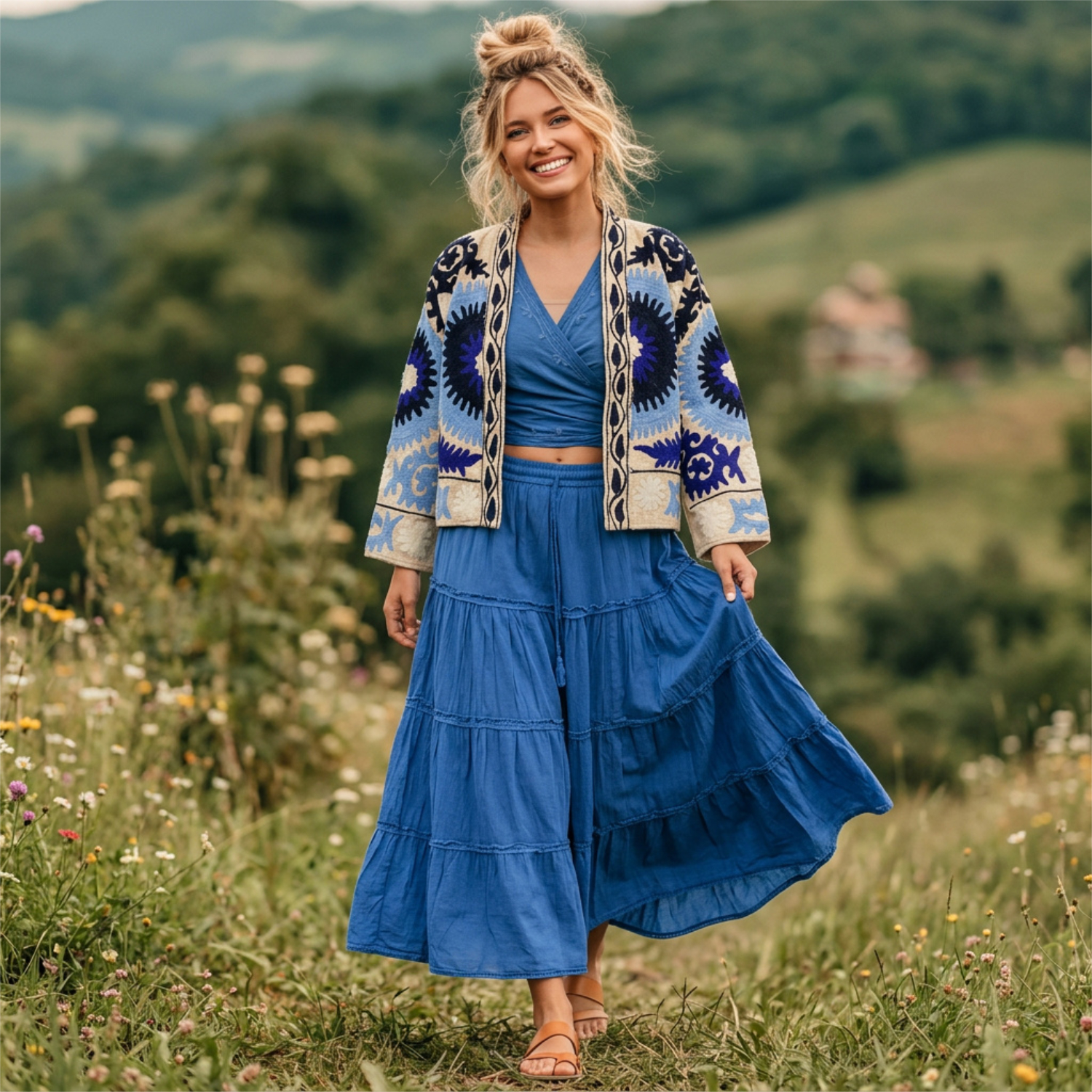 Pure Lebensfreude zum Anziehen! Unsere Suzani-Jacke ist mehr als nur Mode – sie ist ein echtes Statement für alle Boho-Queens, die das Besondere suchen. Auf einem naturweißen Canvas entfaltet sich eine Explosion aus Farben: Die leuchtenden, handgestickten Muster in strahlendem Blau fließen nahtlos von der Vorder- zur Rückseite und sorgen für einen faszinierenden Kontrast.