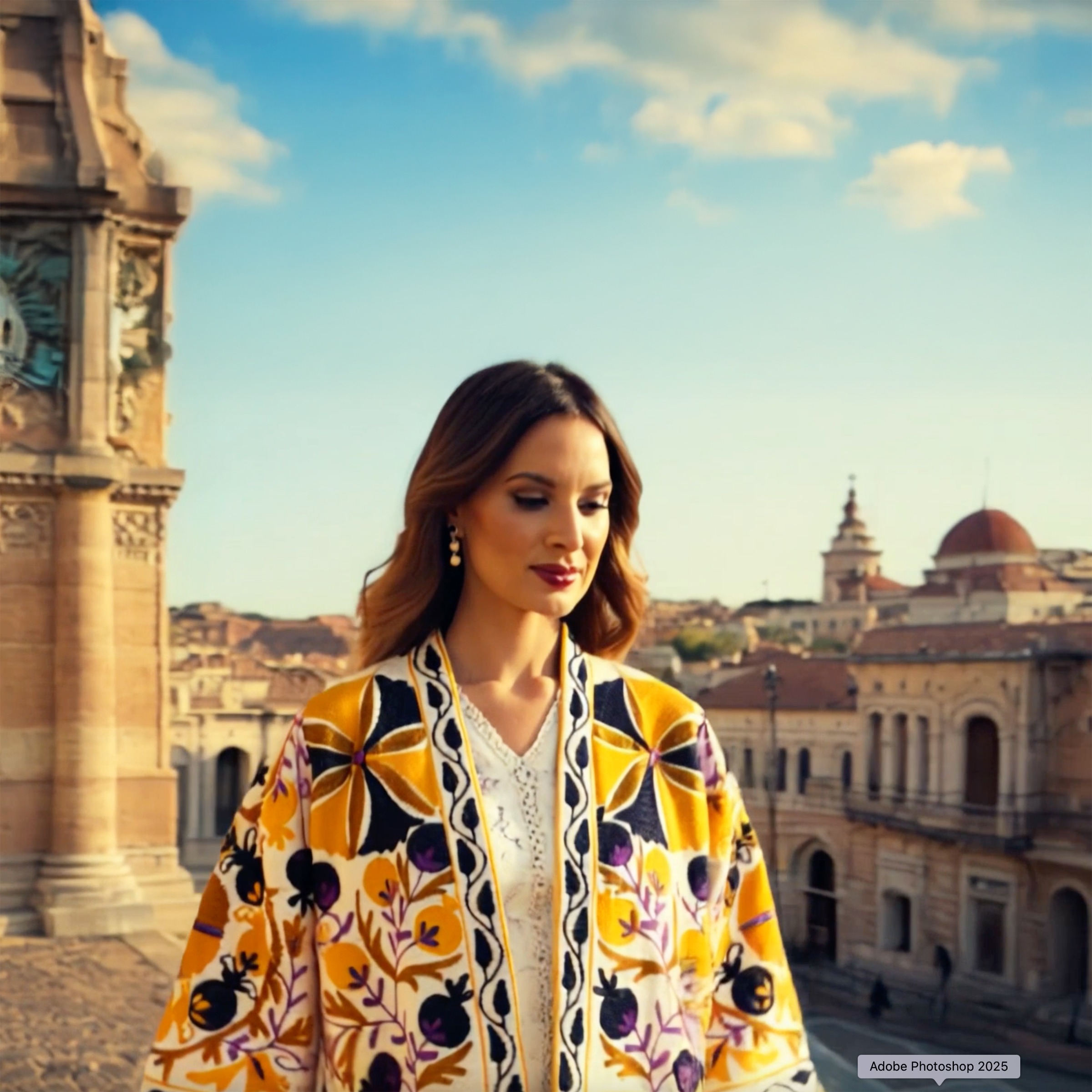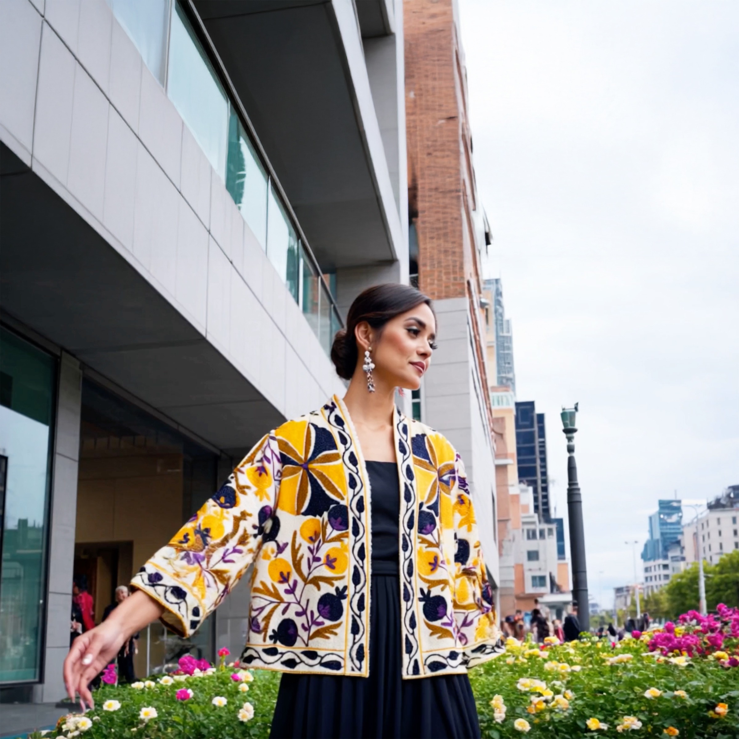 Each piece is meticulously handcrafted with love and great attention to details, featuring intricate Suzani embroidery, known for its vibrant colors and bold floral and geometric patterns that make every piece unique at its own. The colorful embroideries also continue at the back of the jacket.