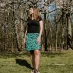 Dit rokje valt op de knie en is makkelijk te combineren met een effen kleur.
