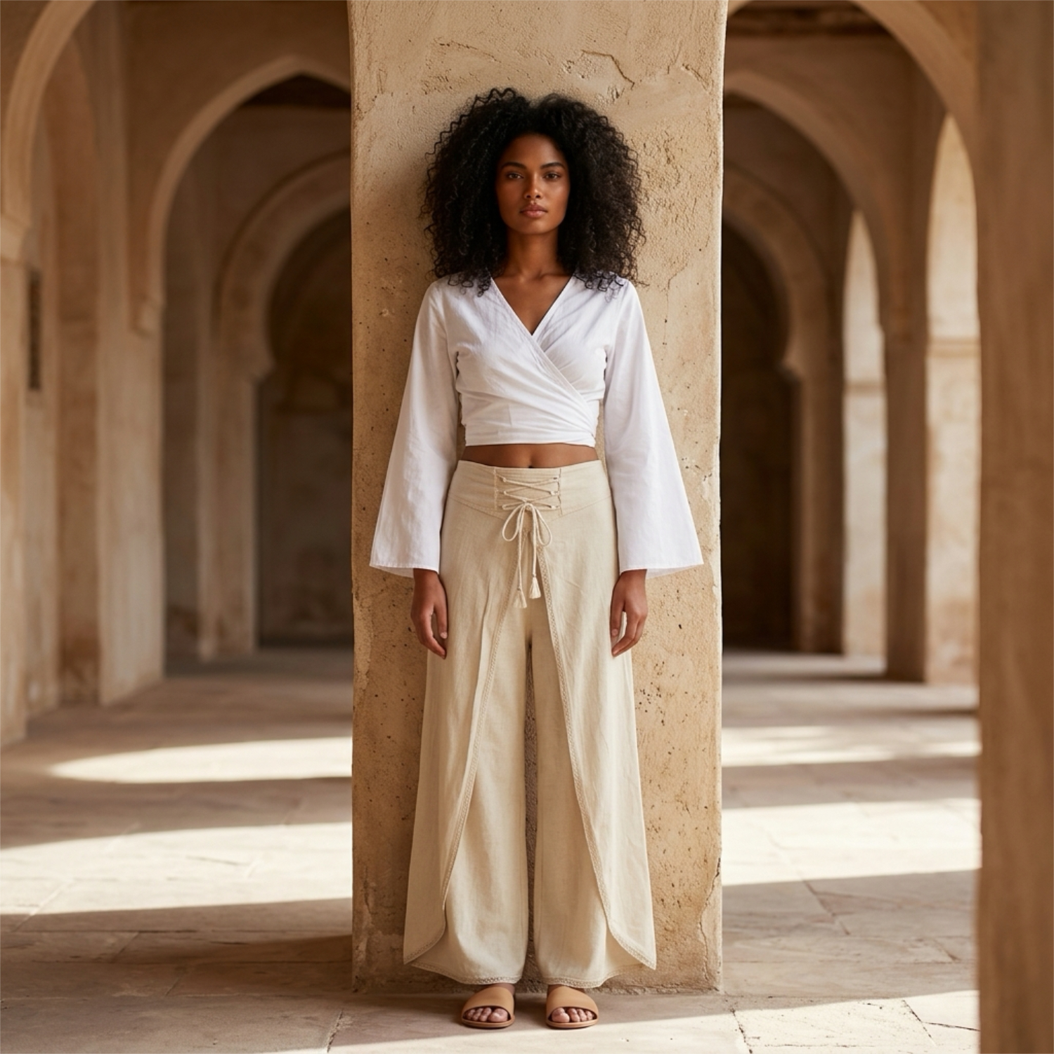 Meet your new mix-and-match obsession: our new trousers in versatile soft beige. Elevate your free-spirited style with an easy-breezy wrap-front design that adds a touch of effortless drama to every step. Whether you’re in the mood for a laid-back city stroll, running through your to-do list, or dancing until sunrise at a festival – these trousers are the ultimate freedom.
